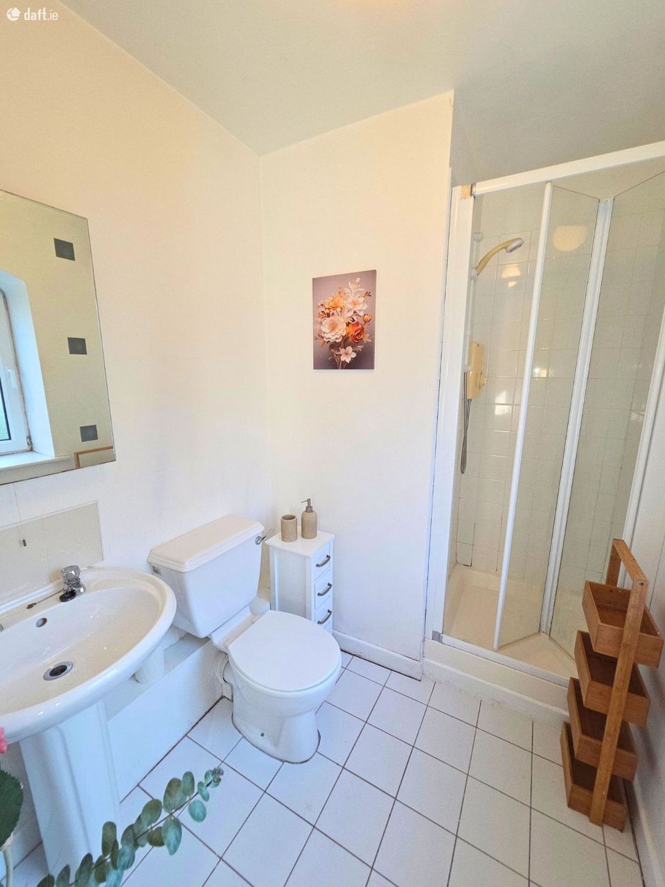 Tiled floor, shower unit, WC, and wash hand basin