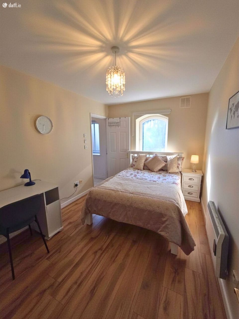 Laminate wood floor throughout, fully fitted kitchen, dishwasher, plumbed for washing machine, dryer, integrated ceramic hob, oven, tiled splashback, breakfast bar.